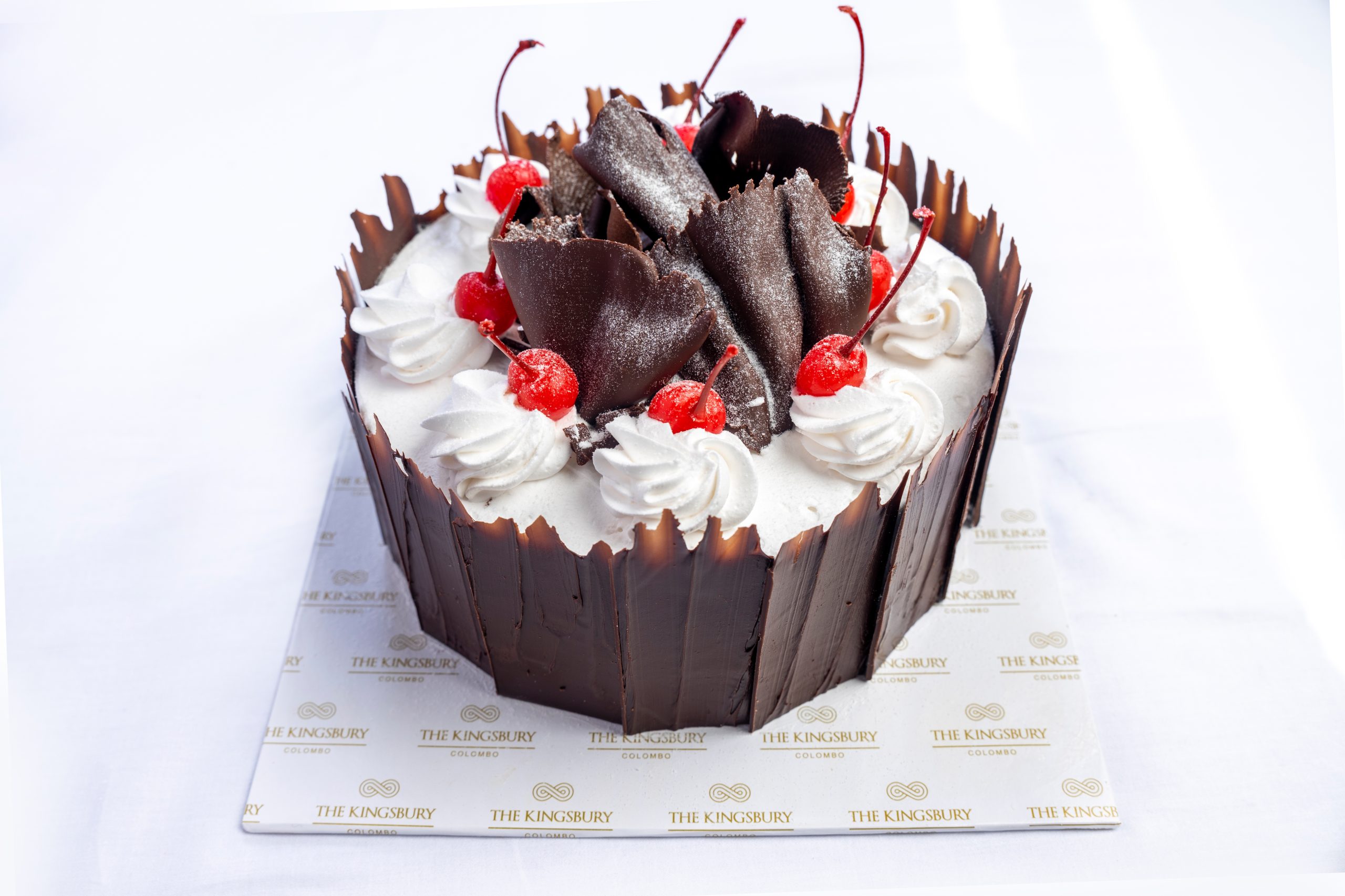 Chocolate Sponge Cake with Dark Chocolate Mousse, Pitted Cherries, White Cream, Dark Chocolate Curls and Snow Dust.
